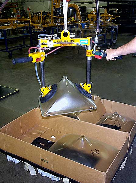VM和VB系列真空吸吊機(jī)是高度集成的單人操作真空搬運(yùn)輔助系統(tǒng), 適用于透氣、半透氣和不透氣物體。 依靠真空吸盤來吸附物體, 通過電動(dòng)或氣動(dòng)葫蘆來提升物體。 系統(tǒng)操作簡單, 安全可靠。VH系列真空吸吊機(jī)具有以下特點(diǎn): 故障率低, 維護(hù)簡單 集成設(shè)計(jì), 最大提升高度2.8米, 最大提升重量500公斤 操作簡單, 通過控制面板來上升、下降和釋放 持續(xù)吸附, 真空泵持續(xù)工作, 物體可長時(shí)間被吸附。 頂部空間小, 僅需要73厘米頂部空間 可選用雙速或無極變速電動(dòng)葫蘆 多功能, 根據(jù)不同物體可更換不同吸盤 應(yīng)用廣泛, 不管什么物體, 透氣、半透氣、不透氣物體都可應(yīng)用